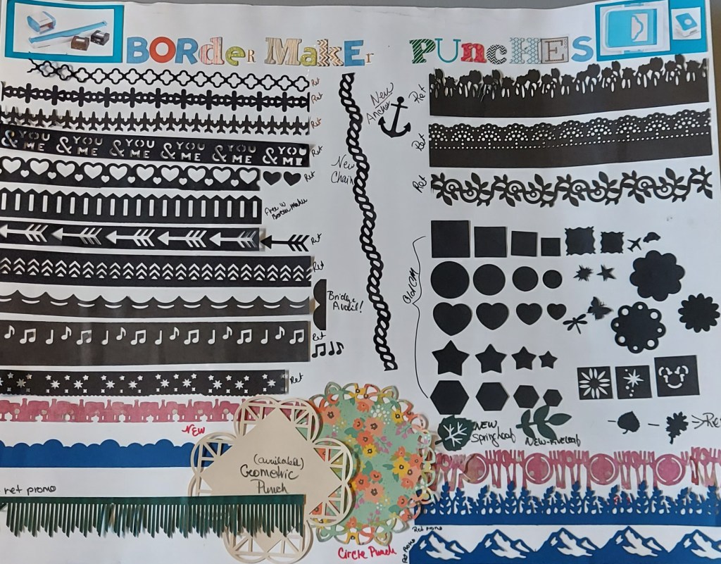 A couple of years ago I made the poster above to demonstrate the many shapes you could make with Creative Memories Punches and Border Maker. Some of these are no longer available, but they’ve also come up with all kinds of new ones. I always want every single one they introduce, but you soon learn to get a little picky.