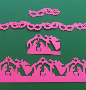 If it makes a single shape the punch is less expensive. The more you can do with with a punch, the more it costs. Some punches can stand alone on the page or make a border, like the Masquerade and Nativity border punches above. In the top picture of the poster, towards the bottom is a beige square. That’s one of the Frame Punches which will either make a border or the square you see above. Then there are the circle punches. They only do one thing and it requires a flipping the paper over in the middle of the process, but CM has only made a few circle punches and they are the most expensive. None are available at this time.