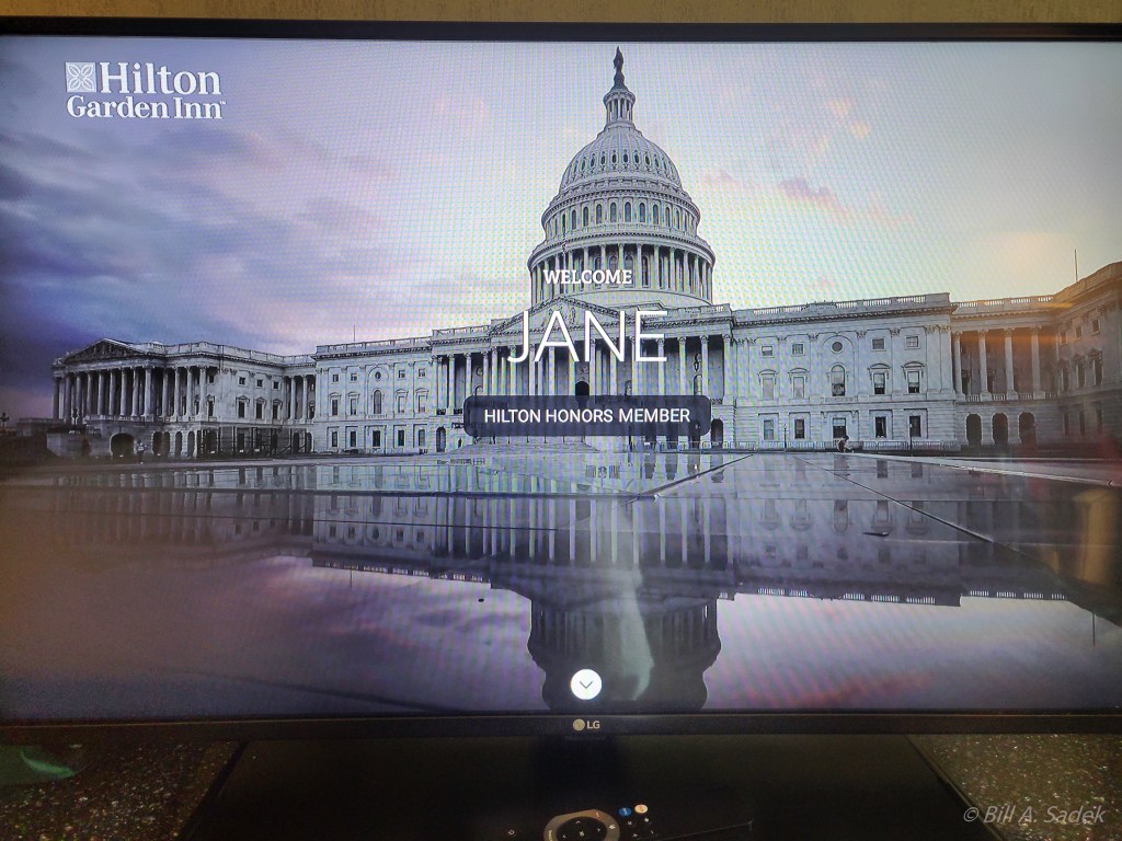 I was also looking for a bargain in Olympia, but the bargain ended up being several notches above the Best Western and that was one of our good surprises. Bill was thrilled when we pulled up to the attractive new hotel. He flirted with the cute reception clerk. Then he was absolutely giddy when we got to the room and he saw the TV screen with the personalized greeting.