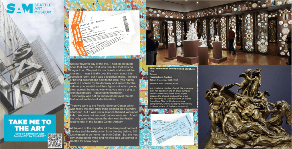 One thing that was easy to choose was the Seattle Art Museum, but working out of an old tour guide, I thought it was going to be free, which it wasn’t. The things you want to see that are free, get a pass. They only have to be slightly good to justify your presence. If you pay, then your expectations go up. For free, SAM would have been fine. That we had to pay made us love it less.