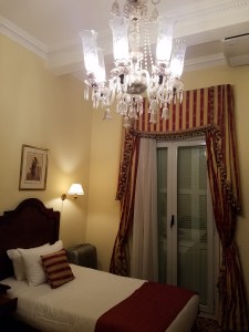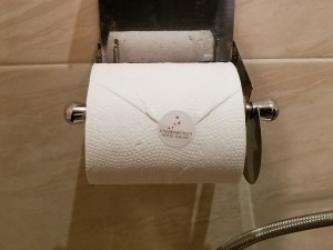 Then we entered our room. It was small, but so lovely that I didn’t even care. Of course my first stop was the bathroom and there I found some comic relief. In the mode of luxury hotels everywhere, the ends of the toilet paper had been folded into a point, but this one was a little off balance. It was just what I needed.