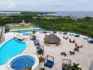 The desk clerk wanted us to be perfectly satisfied with our room and he was a little concerned we’d be unhappy with seeing a little of the parking lot from our balcony. So he showed us a picture from the room and asked, “How does this look?” It looked fine, because it wasn’t a live shot and it didn’t have that green container with all the trash bags in it. He went about checking us into that room.